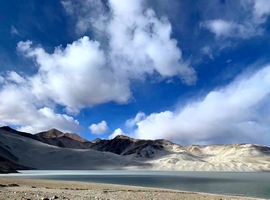 カラクリ湖は、キルギス語で「黒い湖」という意味を持ちます。パミール高原最大の自然湖で、三角形をしており、面積は約4.59平方キロメートルです。 平均水深は約15メートル、最深部は水深30メートルに達します。夏の間、3つの河より水が流れ込みます。 付近には雪豹、アンテロープ、アルガリヒツジなどの貴重な野生動物や、スナヒキ、ユキハスなどの希少植物が生息しています。 バックには7600m級のムスターグ・アタが聳え、大変美しい景色で有名です。