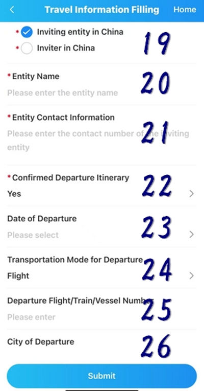 18 中国での受け入れ機関などがあるかを聞かれております。【是】にレ点チェックを入れて下さい。